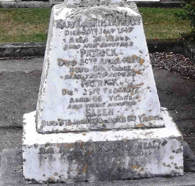 Patrick made his will on 9 November 1911, and appointed Charles Edwin Davey, a solicitor and his son Michael Stephen Healy of Dunedin, Labourer as his executors. They believed the estate to be worth less than 1700 pounds. In his will he requested that he be buried with a suitably inscribed headstone and a railing be erected. He bequeathed all his property to be used by his wife until her death, then divided equally amongst all of his children (they were not individually named). An acknowledgement at the end of the will stated that Patrick was an illiterate person and unable to read or write so he made his mark on the will and had the contents read out and explained to him. (This is in conflict with his occupation as a mine engineer!)
